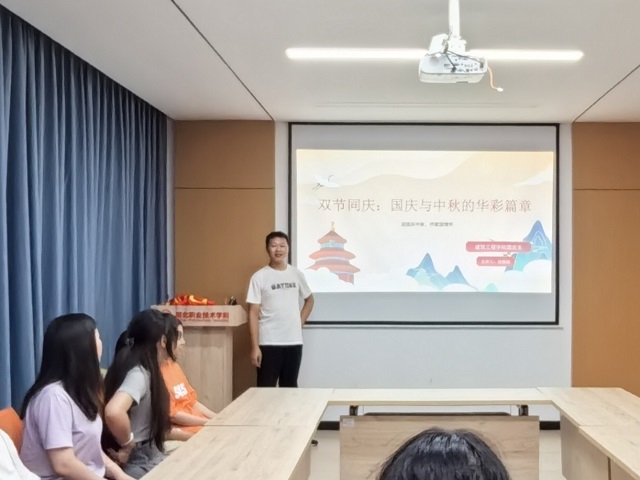 活动伊始,主持人结合丰富的图片与视频资料,讲述了国庆节的历史意义——从开国大典上传遍神州的庄严宣告,到香港回归时升旗现场的激动雀跃,再到今日校园里献给祖国的嘹亮歌声,一段段峥嵘岁月激荡着青春的心潮;从中秋月下嫦娥奔月的古老神话,到阖家团圆品饼赏月的温馨习俗,再到此刻同学们对家国同辉的深切体悟,一缕缕文化馨香滋养着民族的灵魂;从历史长河中国家民族的伟大复兴,到传统佳节里万家灯火的亲情守望,再到当下青年将个人理想融入时代洪流的自觉行动,一份份家国情怀在传承中熠熠生辉。