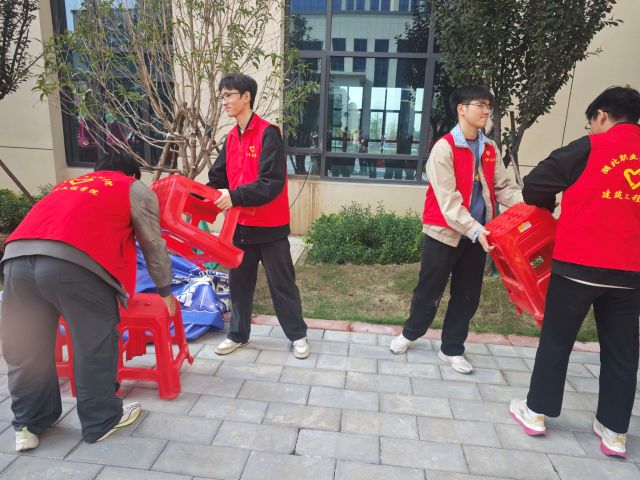 活动当日,文昌阁社区新建养老服务中心门前广场洋溢着喜庆祥和的节日氛围。清晨,我院“建心筑梦”志愿服务队的志愿者们便已提前抵达活动现场。他们紧密配合社区工作人员,投身于紧张的准备工作之中:搬运器材、搭建舞台、布置活动分区、引导参与单位入驻……志愿者们分工明确,行动高效,确保了活动各环节的顺畅衔接。在活动现场及周边,志愿者们还承担起交通疏导的任务,耐心引导人流与车辆,为活动的安全有序进行提供了有力保障,他们忙碌的身影成为活动现场一道亮丽的风景线。