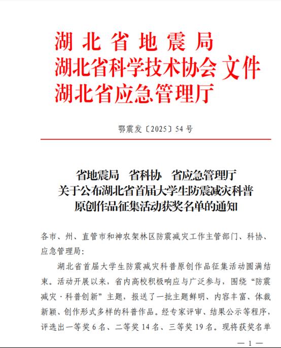 近日,湖北省地震局、湖北省科学技术协会、湖北省应急管理厅联合印发《关于公布湖北省首届大学生防震减灾科普原创作品征集活动优秀作品获奖名单的通知》(鄂震发〔2025〕54 号)。湖北职业技术学院建筑工程学院学子在此次省级赛事中表现亮眼,凭借扎实的专业功底与创新的创作思路,一举斩获2项一等奖、1项二等奖、3项三等奖,充分彰显了学院在科普教育与实践教学融合方面的显著成效。