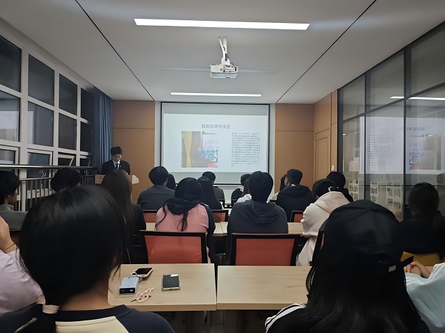 随后,郑强分享了学院2024届优秀毕业生连舒畅的先进事迹。作为一名退役大学生士兵,连舒畅毕业后牵头成立了湖北省首个高校大学生退役军人协会,担任会长兼团支部书记。他带领团队组织无偿献血等志愿活动400余场,个人累计献血67次,献血总量达26100毫升。连舒畅学长的奉献精神深深感染了在场学子,引起热烈反响。