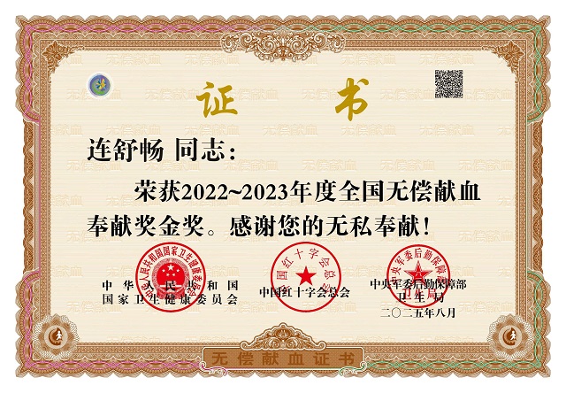 近日,从国家卫生健康委员会传来喜讯,我院优秀毕业生、中共党员连舒畅因在无偿献血事业中的突出贡献,荣获“全国无偿献血奉献奖金奖”。