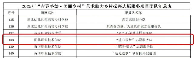 近日,我院建心筑梦志愿服务队成功入选2025年“青春手绘·美丽乡村”艺术助力乡村振兴志愿服务项目立项名单。