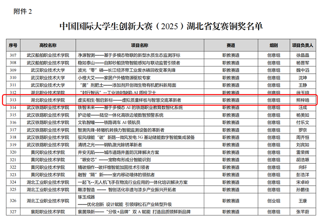 近日,中国国际大学生创新大赛(2025)湖北省复赛获奖名单正式公布。我院参赛项目《虚实相生·智启新标——虚拟质量样板与智慧交底革新者》脱颖而出,荣获湖北省复赛铜奖。
