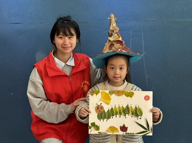 经过一个多小时的创作,一幅幅充满童趣与创意的作品新鲜出炉。孩子们兴奋地展示自己的“毛毛虫”“兔子”等作品,每一幅都承载着童真的喜悦。大家围在一起分享创作想法,志愿者还与孩子们并肩合影——戴着树叶魔法帽的小女孩举着自己的毛毛虫作品,笑容格外灿烂,定格下这充满欢乐与温情的时刻。