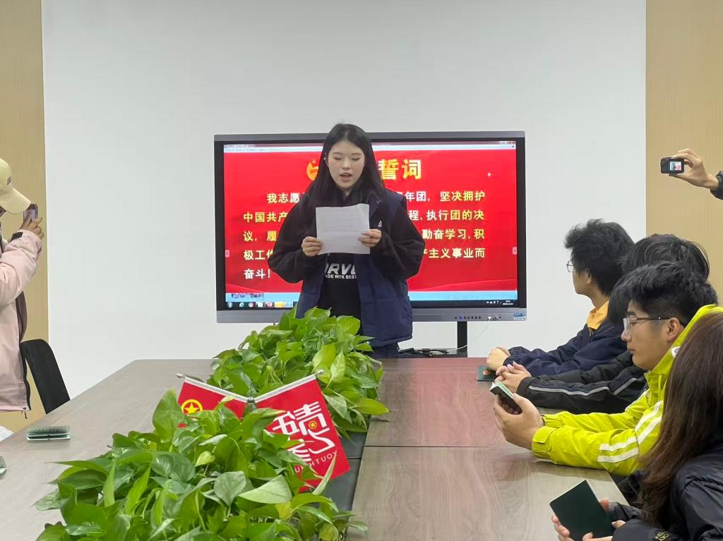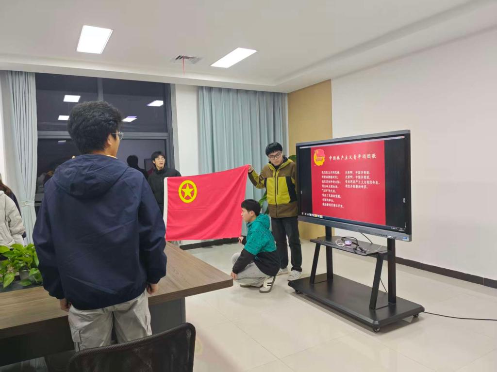 宣誓环节,由赵震华部长领誓。他面向团旗,举起右拳,声音铿锵有力;新团员们紧随其后,以同样昂扬的姿态庄严宣誓,“为共产主义事业而奋斗”的誓言在青年之家回荡,彰显着新团员对团组织的赤诚与对理想信念的坚定。