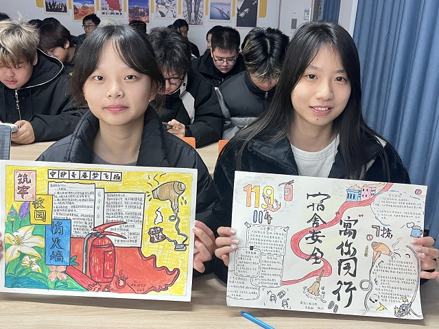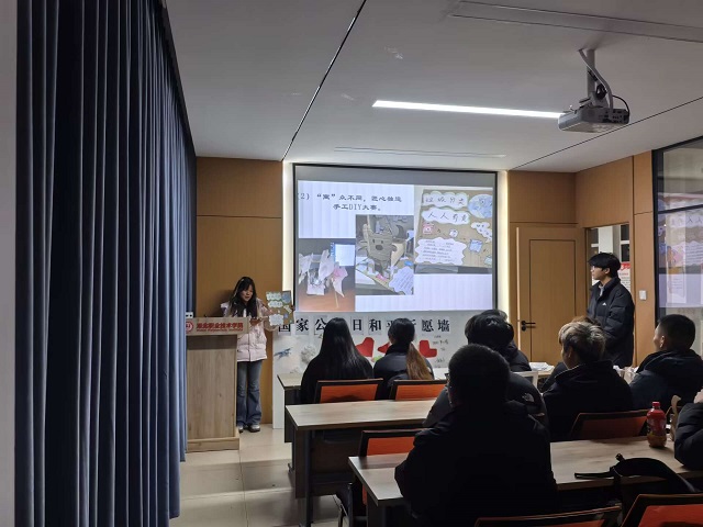 随后进入作品展示讲解环节,前期实践中的优秀作品集中亮相,成为传递冬日温情与文化内涵的重要载体。创作者们依次上台,分享作品背后的灵感来源与创作故事。有的同学通过精心绘制的手抄报,生动普及用电安全、防火防盗、应急逃生等宿舍安全知识。有的同学利用环保手袋、废旧纸张、改造旧物等材料,创作出各式精巧的手工作品。有的同学通过镜头捕捉宿舍生活中的温暖瞬间。