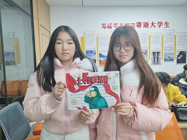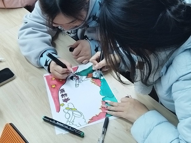 分享环节结束后,长津湖主题创意绘画活动随即展开。同学们两人一组,或为志愿军冲锋线稿填色,或自主构思创作。大家以热烈的红色描绘国旗与军功章,以清冷的蓝色勾勒冰雪天地,将“冰雪铸军魂,吾辈当自强”的致敬语句融入作品中,使红色精神与专业思维在画纸上交织融合。