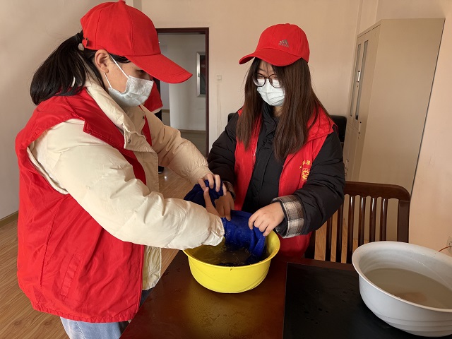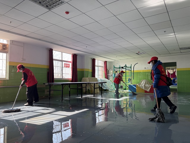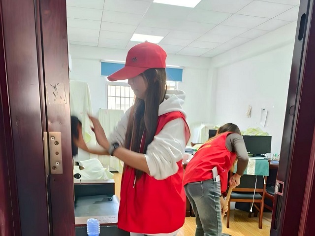 志愿者们分工明确、配合默契。一部分志愿者清扫公共区域,仔细打扫院落落叶与杂物,反复擦拭走廊地面,使往日积尘的角落变得洁净如新;另一部分志愿者专注室内环境,擦拭门窗玻璃、桌椅扶手,对活动室设施进行消毒,并将物品归类整理、摆放整齐;还有志愿者重点清理卫生死角,刷除墙面污渍、清除地面顽固污迹,不遗漏任何一个细节。劳动过程中,大家热情饱满,不怕脏、不怕累,在互帮互助中展现出青年志愿者勤劳奉献、积极向上的精神风貌。