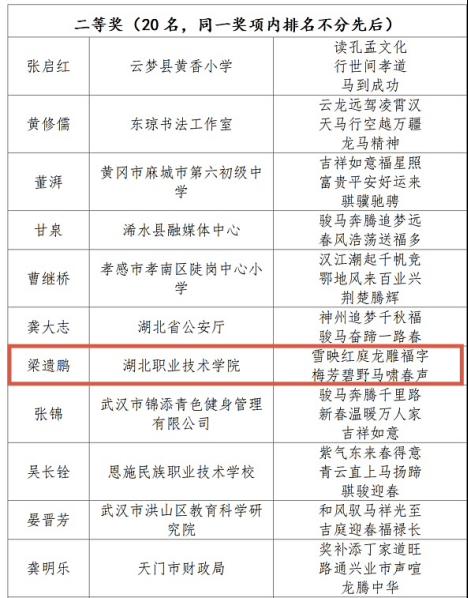 近日,由湖北省总工会、湖北省文学艺术界联合会联合举办的“翰墨迎新春·匠心颂荆楚”全省职工春联书法作品征集交流活动评选结果正式揭晓。经专家对参赛作品进行初评、复评和终评三轮评选,湖北职业技术学院梁遗鹏教授的书法作品从众多参赛作品中脱颖而出,荣获大赛二等奖。