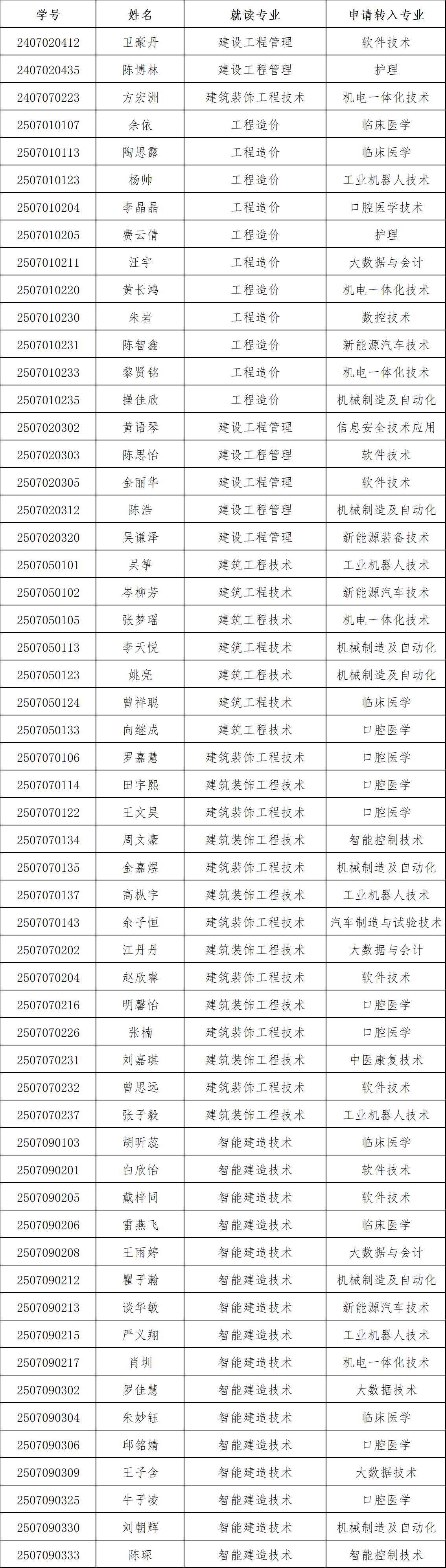根据《湖北职业技术学院学生转专业管理办法》(鄂职院发〔2023〕19号)规定,按照《湖北职业技术学院2025级学生转专业工作方案》相关要求,经学院与招生与就业创业指导处、学工处、教务处会审,以下学生通过申请转专业资格审查。现予以公示。在公示期内,如有异议,可以向学院提出。我们将对反映的情况进行调查核实。