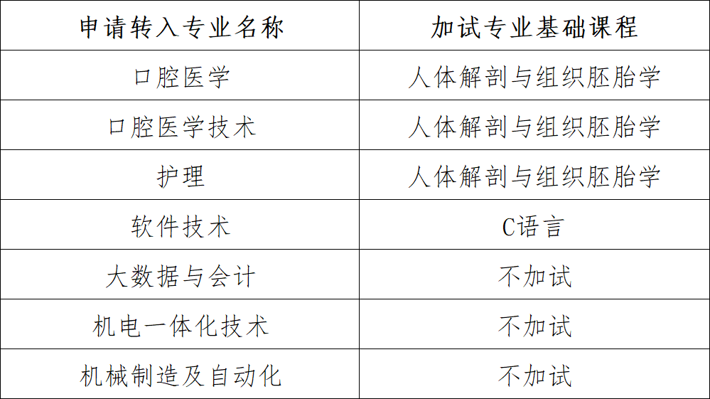 由于下列专业申请转入人数超过拟转入名额,申请转入下列专业的学生需参加学校统一组织的转专业选拔考试,考试科目为第1学期开设的《思想道德与法治》和《公共英语》,部分专业还需加试专业基础课程,具体情况如下: